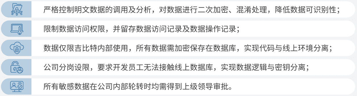 公司對用戶個人信息實施脫敏處理,,,,嚴格限制用戶信息用途,,,數據使用完成后集中歸檔處理。。。。為進一步確保數據處理過程的安全,,,,公司根據實際的業務工作分崗設限,,最大程度保護數據隱私安全,,如在生產網絡中的加密數據由研發部門員工負責編寫加、、、、解密程序,,但其無法直接訪問到加密后的數據庫;程序的加、、解密密鑰由運維員工單獨配置。。。。