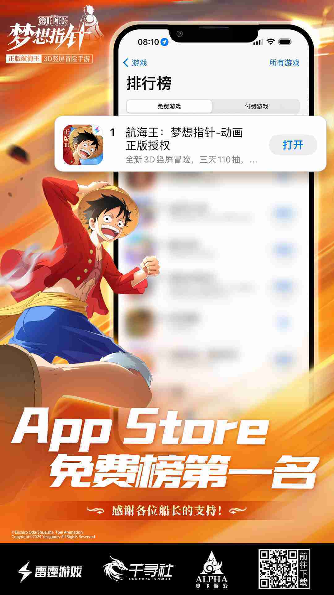 4月1日,,,,手游《航海王::夢(mèng)想指針》正式公測(cè),,,,上線僅2小時(shí)不到就登上了App Store免費(fèi)榜Top1,,,與TapTap熱門(mén)榜第一。。。。