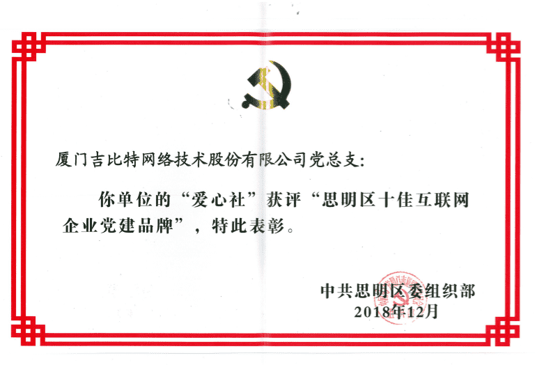 經初審評選、、、、網絡評選和專家評審等環節,,"廈門一競技網絡技術股份有限公司黨總支-愛心社" 從全區28個參評黨建品牌中脫穎而出,,獲評"思明區十佳互聯網企業黨建品牌"。。